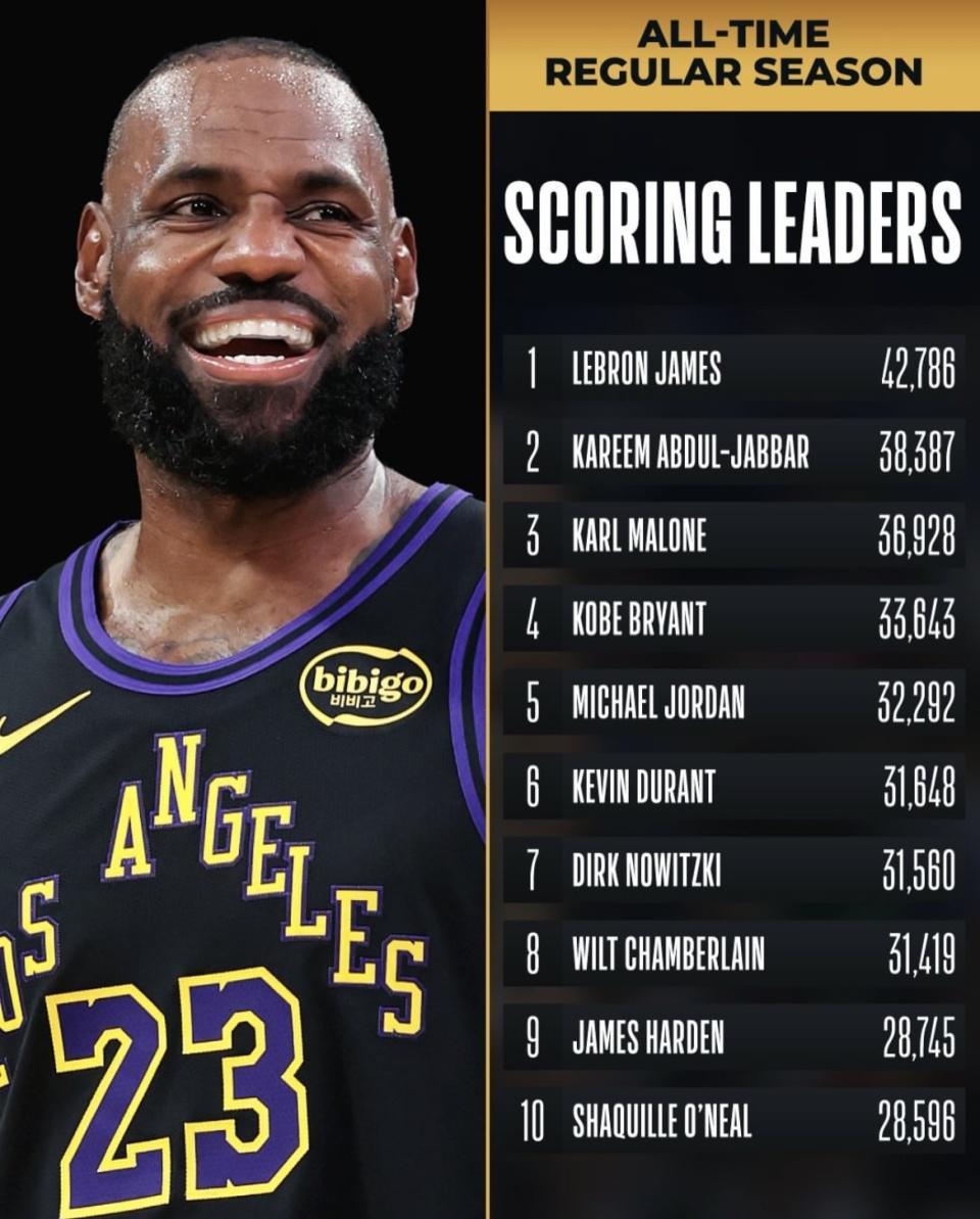 把视角拉回榜首,詹姆斯以42,786分排在第1,贾巴尔以38,387分排在第2,两者差距达到4,399分。